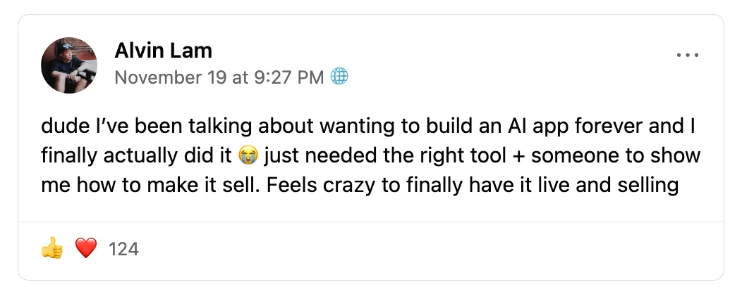 3. Because I also run a private community for digital product builders where I share what's actually working RIGHT NOW – it has new AI tools, product ideas that are crushing it, and real-time feedback on your ideas. I'd rather invite ppl who've already shown me they're serious about building a real digital product business. (And no, this isn't an upsell – you can put your credit card away. I just want serious people in the group.)